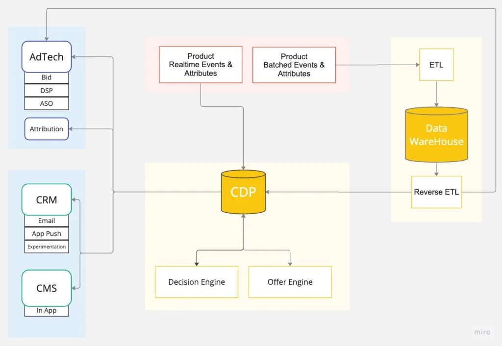 A typical stack might include a CRM system, often a third-party integration, equipped with omnichannel communication features like email, push notifications, in-app messaging, SMS, and landing pages, coupled with segmentation and analytical tools. Then there are Content Management Systems (CMS) – particularly for app-centric products, these are custom-built solutions facilitating the strategic display of products and ads, enhanced with personalization and segmentation features. Additionally, unified data repositories, whether they’re Customer Data Platforms (CDPs) or custom-built integrations, play a critical role in consolidating customer data, streamlining identity management, and enhancing targeting through calculated attributes, such as predictive modeling or lifecycle stages.