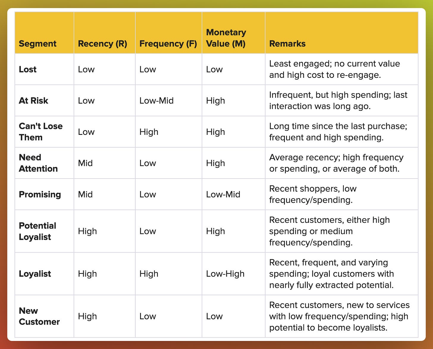 This table provides a view of the different customer segments based on RFM analysis, along with remarks to understand their current engagement level and potential. This should help guide you when selecting your own RFM segmentation.